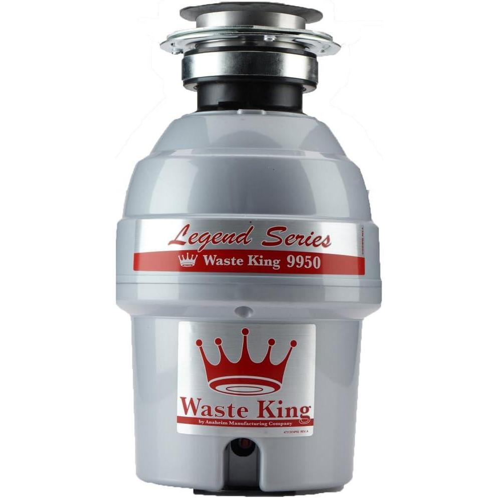 Waste King 9950: 3/4 horsepower garbage disposal with pre-installed power cord and sound insulation. Energy efficient permanent magnet motor and stainless steel swivel impellers reduce jamming. Durable, all-metal mounting assembly. Rust and corrosion-proof glass-filled nylon grind chamber and drain housing with stainless steel grinding components. Continuous feed technology. Front-mounted reset button for easy use. Safe to use with properly-sized septic tanks.